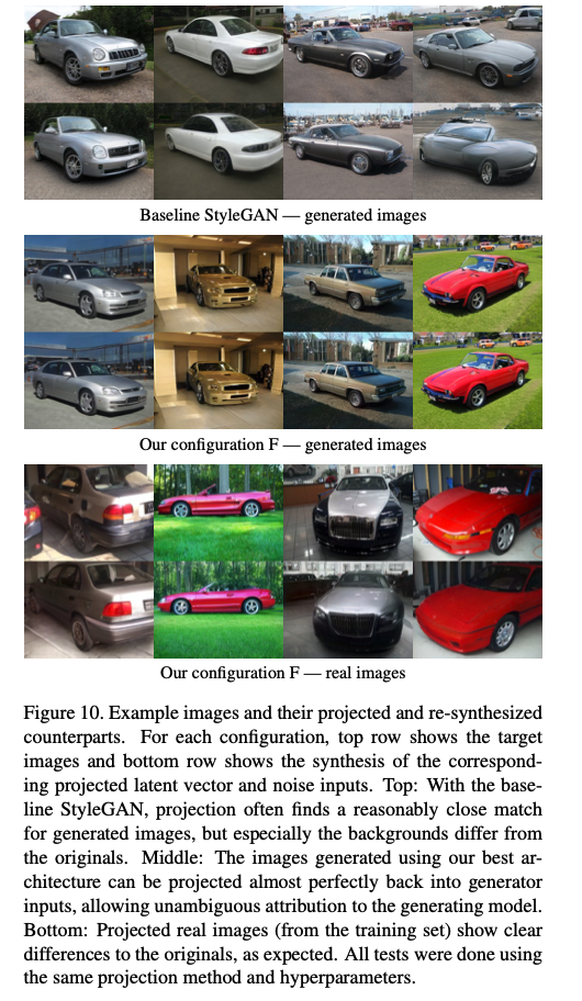 StyleGAN2는 StyleGAN, 실제 이미지보다도 잠재공간에의 투영이 잘 되고 있다는 것을 알 수 있다. PPL에 관해서 정규화 항에 잠재공간을 부드럽게 하는 것으로 이러한 결과가 나타났다고 생각된다. 실제로 원본 이미지 → 잠재공간으로의 반영 → Generator로 재구성한 프로세스를 거친 이미지가 바로 아래의 이미지이다. StyleGAN, 실제 이미지는 원본의 곳곳과 다른 특징을 가지고 있지만, StyleGAN2는 꽤 정확하게 재현하고 있음을 알 수 있다.