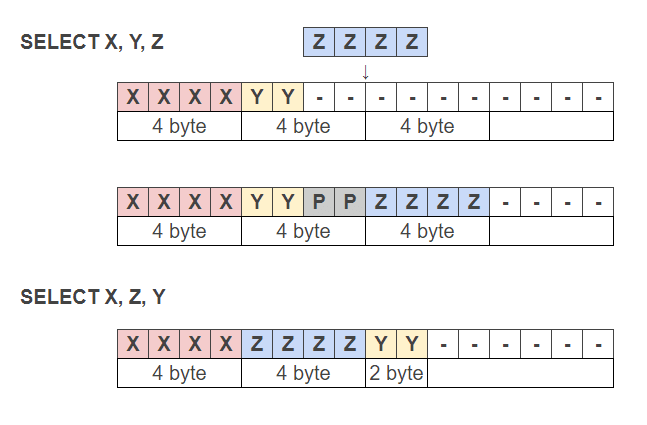 예를 들어 X(int4), Y(int2), Z(int4)이라는 순서로 배치하면 X, Y를 계속해서 배치한 후, 계속해서 Z를 배치하는 것이 일반적이지만 Z는 4배수 위치에서 시작할 필요가 있으므로, 자동적으로 2바이트만큼 패딩된 후에 배치되게 된다.