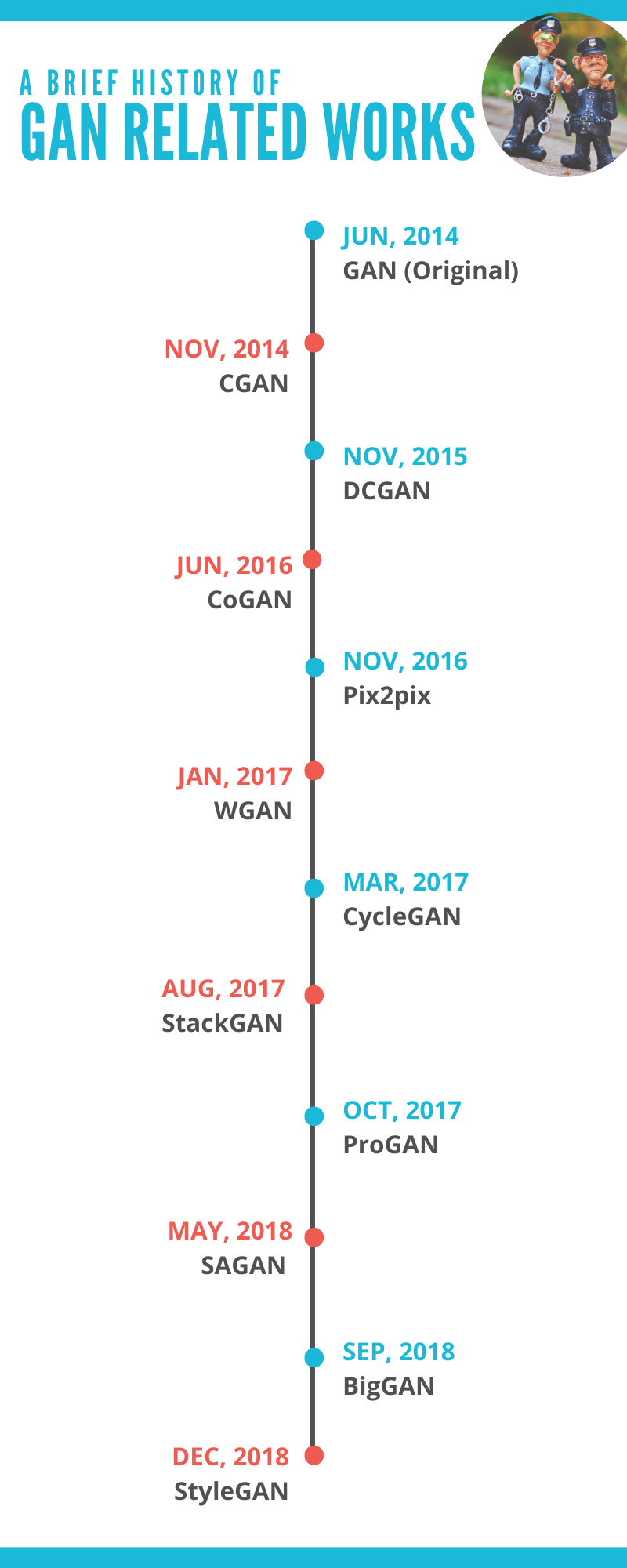 2014년 발표된 GAN(Generative Adversarial Network)는 획기적인 연구로 최근까지 파생 연구가 굉장히 많다. 따라서 GAN관련 연구 흐름의 아웃 라인을 파악하고 싶은 사람이나 각각의 연구관련 논문과 코드로 한 번에 이동하고 싶은 사람을 위해 이러한 포스팅을 작성했다. 주로 참고하여 작성한 포스트는 링크를 확인해달라.