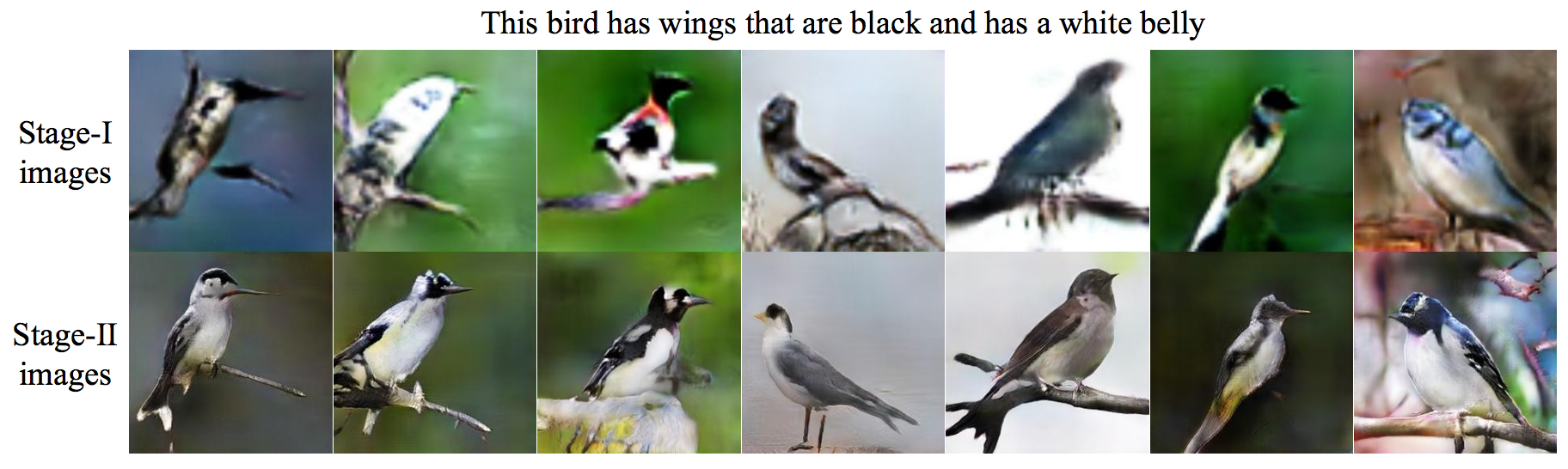 논문 참고. '이 새는 검은 날개를 가지고 복부는 하얗다'라는 텍스터로부터의 이미지가 생성된 것이다.