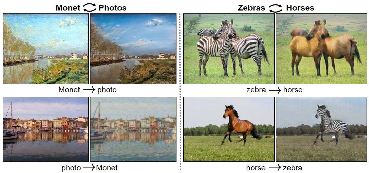 ▶ 포인트: 짝으로 되어있지 않은 2개의 이미지가 훈련데이터로써 전달될 때, 한쪽의 이미지가 다른 한쪽으로 변환이 가능하게 되었다.