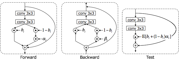 (L은 residual 모듈의 수) 이는 훈련시의 '초기값으로 볼 때의 깊이'가 얕아지고, 학습에 필요한 시간이 단축됨과 동시에 dropout과 같은 정규화 효과가 실현된다. 또한, 테스트시에는, 각가의 residual 모듈