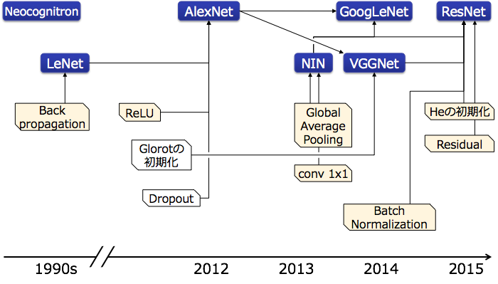 지금까지 설명한 ILSVRC에 있어서 특히 중요한 구조 및 기술 요소를 정리한다. 현재 사실상의 표준을 말할 수 있는 ResNet에 이용되고 있는 기술요소에 대해 주목해보자면, 스킵 연결이라는 가장 중요한 기술 요소야말로 ResNet에서 처음 이용되고 있지만, 그 외의 기술 요소는 지금까지의 CNN의 진화의 과정에서 도입된 것이 많고, 정확히 CNN의 집대성이라고 말할 수 있는 아키텍쳐라는 것을 알 수 있다.