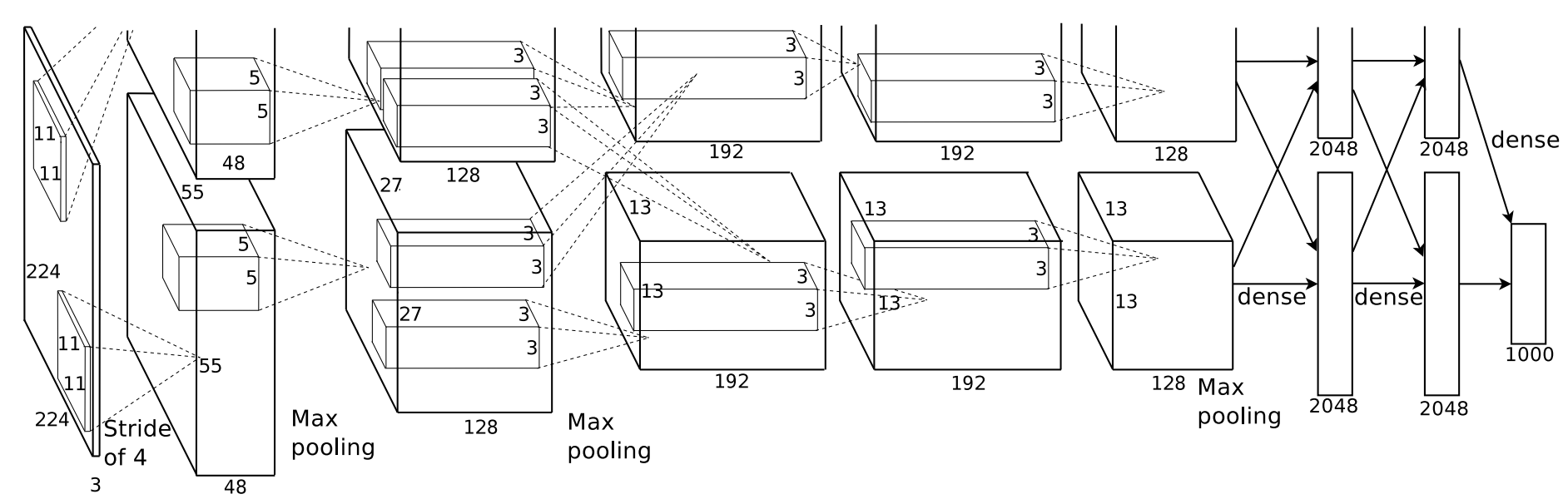 위 그림은 AlexNet의 구조이다. AlexNet은 Convolution층이 5개가 거듭되어 있으면서 pooling층에서 특징 맵을 압축한 뒤 3층의 전결합층(FCN)에 의해 최종적으로 출력을 얻는다. 기본적인 구조의 설계 사상은 Neocognitron이나 LeNet을 답습하고 있다. 학습할 때는, 당시의 GPU의 메모리 제약으로 인해, 각층의 특징 맵을 채널 방향으로 분할해, 2대의 GPU로 독립적으로 학습하는 방식을 취했다. 몇개의 Convolution 층 및 FCN층에서는 보다 유효한 특징을 학습하기 위해 또 다른 한 대의 GPU가 담당하고 있는 채널도 입력으로써 이용하고 있다.