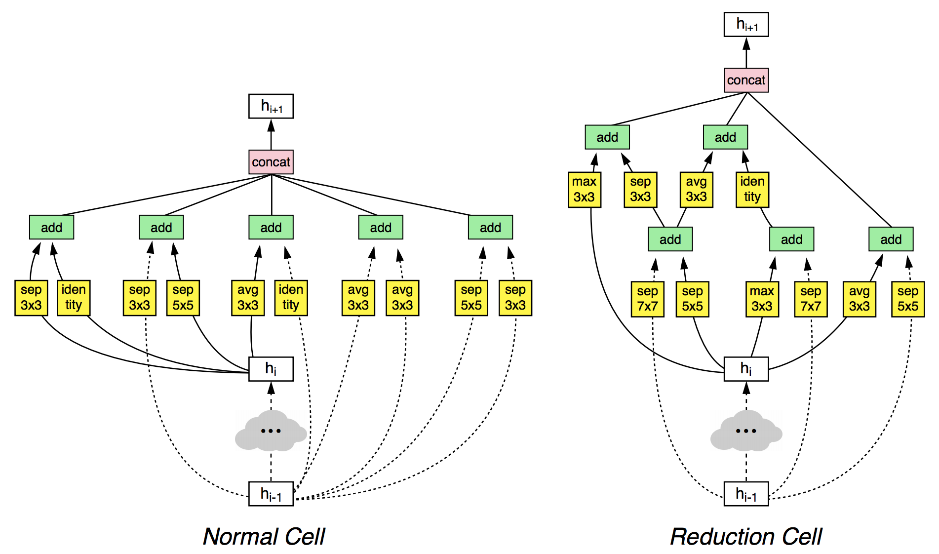 또한, 자동설계된 normal cell 및 reduction cell에 대해서도, 이용가능한 구성요소가 아래와 같이 한정되어 있으며, conv 3x3과 같은 일반적인 구성요소가 separable Convolution과 같은 파라미터 수가 적은 요소만을 이용하여 검색의 효율화를 하고 있다고 말할 수 있다.