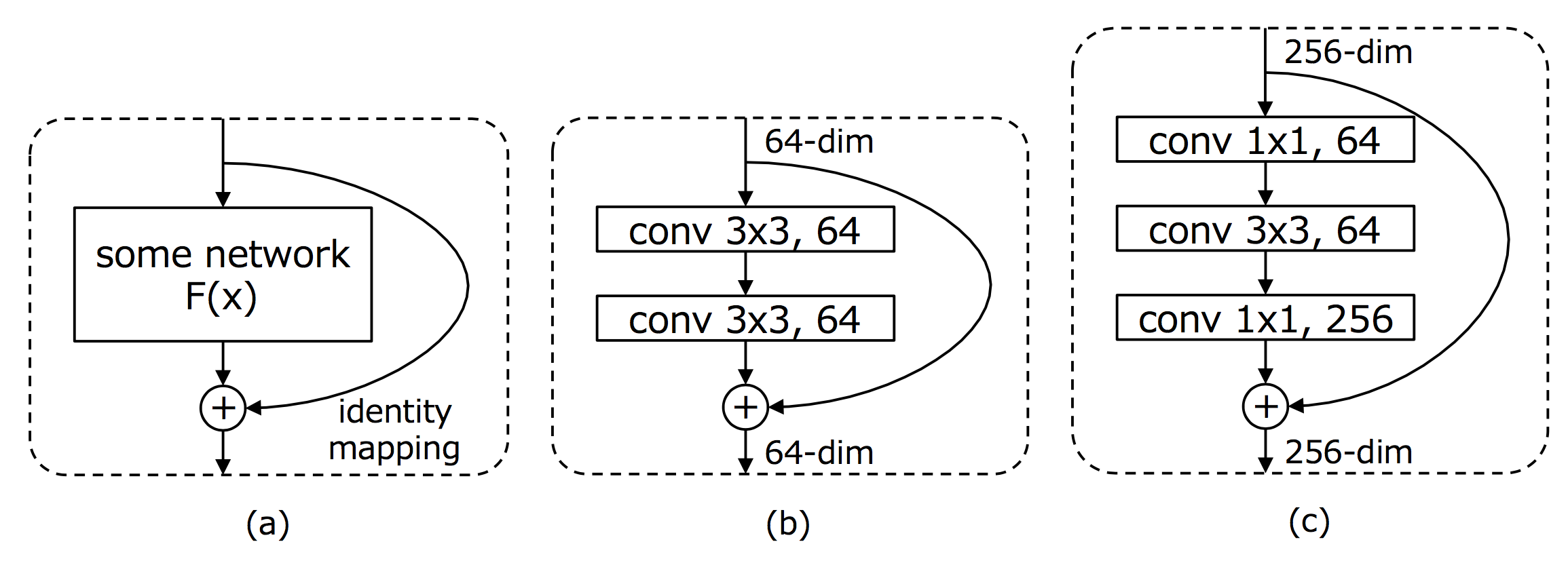 (c)는 residual 모듈의 bottleneck버전이라고 불리고 있으며 1x1의 Convolution을 사용하여 차원 감소를 한 후에 3x3의 Convolution을 실시한 후, 그 이후 1x1에 의해 저차원을 복원하는 형태를 취하는 것으로, (b)와 동등한 계산량을 유지하면서, 보다 깊은 모델을 구축할 수 있다. 실제로 (b)의 residual 모듈을 이용한 ResNet-34와 비교하여, 동등한 파라미터 수를 가진(c)의 모듈을 이용한 ResNet-50는 크게 정확도가 계산됐다고 보고됐다.