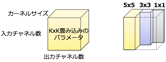 위에서 언급한 Inception모듈의 구성을 표시하였다. Inception모듈에서는 네트워크를 나눠서 사이즈가 각각 다른 Convolution을 실시한 후, 출력된 것을 합치는 처리를 한다. 이 목적은 Convolution층의 가중치를 sparse하여 파라미터 수의 트레이드 오프를 개선한 것이다.