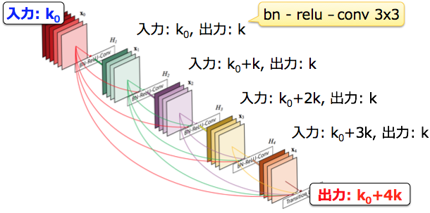 여기서, Dense블록에의 입력의 채널 수를 K0, 각 레이어의 출력을 Fl(·)의 채널 수를 k로 한다면, l번째의 레이어의 입력 채널수를 k0+k(l-1)이 된다. 이렇듯, 입력채널수가 k씩 증가하므로, k는 네트워크의 성장률 파라미터라고 불린다. 또한, 각 레이어의 처리 Fl은 bn-relu-conv 3x3에 의해 구성된다. 아래의 그림은 레이어 수가 4의 Dense블록은 예이다.