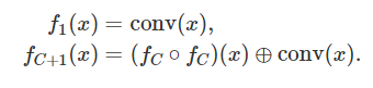 FractalNet은 아래처럼 재귀적으로 정의된 fractal 블록을 이용하여, ResNet과 같은 쇼트 커트를 이용하지 않고 깊은 네트워크를 학습하는 것이 가능한 모델이다.