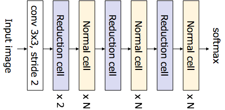 구체적으로 67번 논문에서는 ImageNet데이터세트에 대해서는 아래와 같은 전체 구조를 가진 구조를 설정한다. 여기서 normal cell은 residual모듈과 같은 특징 추출을 실행하는 모듈이며, reduction cell은 다운 샘플링 및 특징 추출을 실시하는 모듈이다.