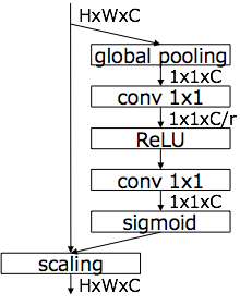 SE Block은 이름대로, Squeeze스킵과 Excitation 스팁의 2단계의 처리를 하고 있다. Squeeze 스킵은 HxWxC의 특징맵에 대해 GAP가 적용되어 이미지의 전체적인 특징이 추출된 1x1xC의 Tensor이 출력된다. 다음인 Excitation스킵에서는 1x1의 Convolution에 의해, 특징 맵의 채널간의 의존관계가 추출된다. 구체적으로는 출력 채널수가 C/r의 1x1의 Convolution이 적용되어 ReLU를 거친 뒤, 출력 채널 수 C의 1x1의 Convolution가 적용된다. 최종적으로 시그모이드 함수가 적용돼, 특징맵의 채널 마다의 가중치가 출력된다. 이런 채널 마다의 가중치를 이용해 특징 맵을 스케일링하는 것으로 이미지 전체의 문맥에 따라 특징 선택을 실현할 수 있다.