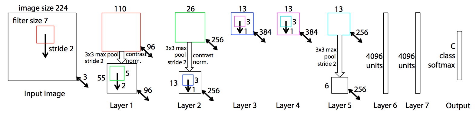 이라는 개선을 실시하여 AlexNet을 뛰어넘는 인식정밀도를 달성하였다. 최종적으로 ZFNet의 구조는 아래의 그림과 같다. Layer 2의 max pooling 이후의 구성은 AlexNet과 동일하다. (AlexNet은 GPU2개로 학습을 하기 위해 모델을 분리하였지만, ZFNet은 1대의 GPU로 학습을 하고 있다.)