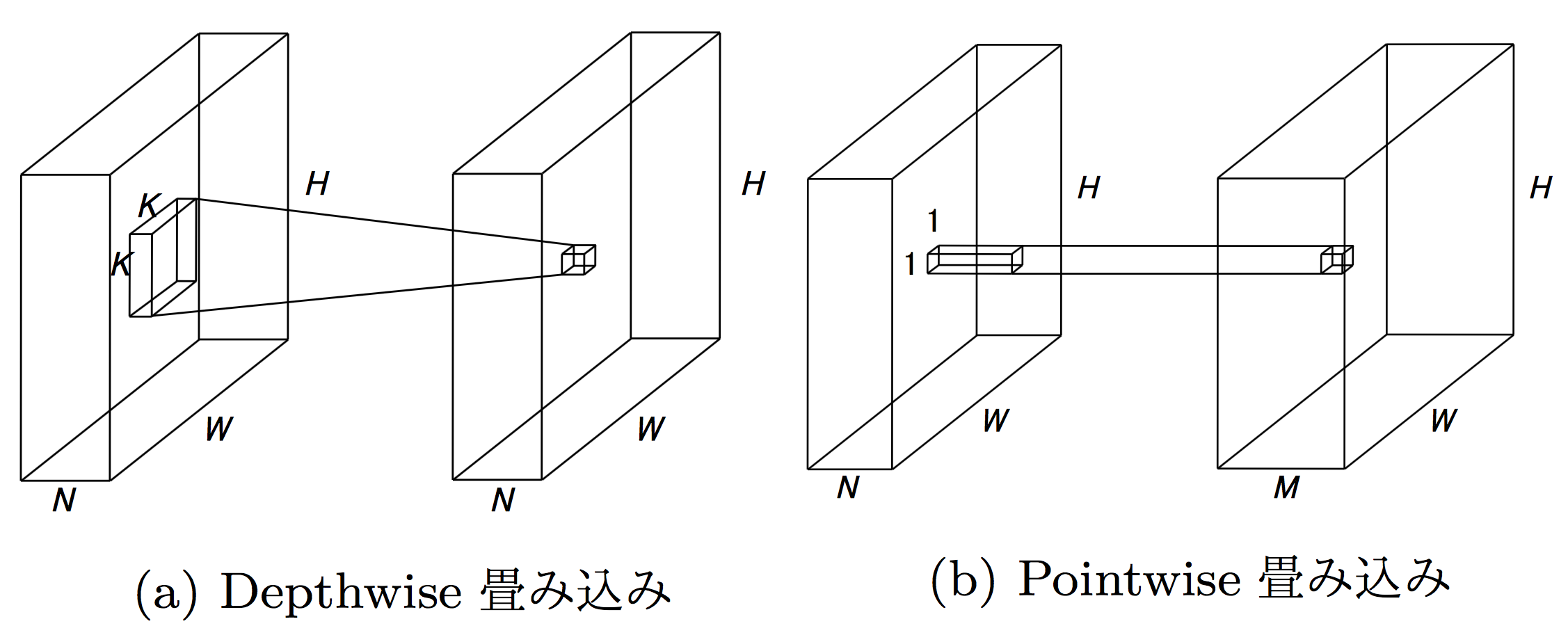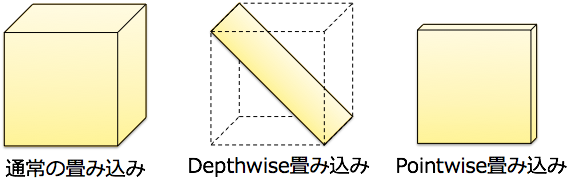 Depthwise Convolution은 특징맵의 채널마다에 각각 독립적으로 공간 방향의 Convolution 처리한다. Pointwise Convolution은 이 기사에도 몇 번 등장하였다. 1x1의 Convolution을 의미한다. 입력 특징 맵의 사이즈가 HxWxN, 출력 채널수가 M의 경우, 보통의 KxK Convolution의 계산량은 O(HWNKKM)이 된다. 한편, depthwise Convolution의 계산량은 O(HWNKK), pointwise Convolution의 계산량은 O(HWNM)이 된다. 즉, 보통의 Convolution을 separable Convolution(depthwise Convolution + pointwise Convolution)을 바꾼 것으로 계산량이 O(HWNKKM)에서 O(HWNKK+HWNM)으로 감소된다. 비율은 1/K제곱+1/M이 되어있으며, 보통 M >> K제곱 (예 K=3, M=64)에서 계산량이 1/K제곱정도로 감소된다.