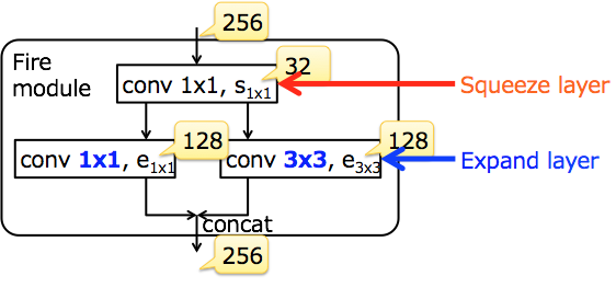 Fire모듈뿐에서는 먼저 residual모듈의 bottleneck버전이나, Inception모듈로 squeeze 레이어의 1x1 Convolution에 의해 입력특징맵의 차원을 감소시킨다. 그 이후 expand레이어의 3x3의 Convolution에 의한 특징추출을 실시하면서 차원의 복원을 하지만, 그 일부를 1x1 Convolution로 치환한다. 이것은 Inception모듈처럼, 명시적으로 spares한 Convolution을 실행하는 것으로 파라미터 수를 감소하는 효과가 있다. 62번 참고문헌에서는 입력 채널수와 squeeze 레이어의 출력 채널수 s1x1의 비 및 expand레이어의 1x1 Convolution의 출력 채널 수 e1x1과 3x3 Convolution의 출력 채널수 e3x3의 비를 조정하는 것으로 정확도가 낮아지는 것을 방지하면서 파라미터의 수를 대폭 감소할 수 있다고 말하고 있다.