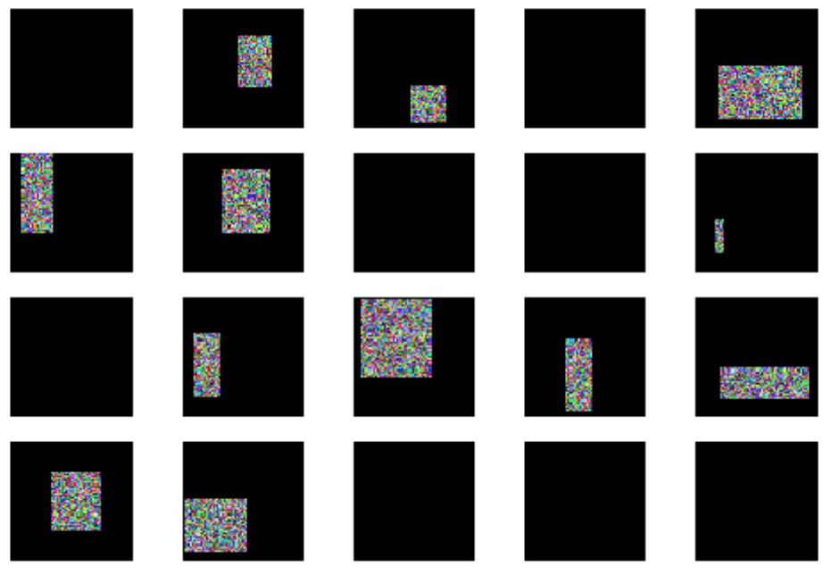 Random Erasing에서는, 각 이미지에 대해 마스크를 사용할 것인지, 마스크 영역의 사이즈, 화면 비율, 장소를 랜덤으로 정하여, 마스크 영역의 화소값을 픽셀 레벨로 랜덤한 값을 치환하는 처리를 한다. 단순한 방법이지만, 이미지 분류 업무뿐만 아니라 물체 조합 업무에도 효과가 있다고 확인됐다. 아래의 그림은 Random Erasing을 실시한 화면의 예이다.