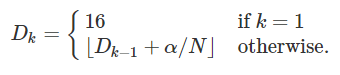 PyramidNet에서는 down sampling하는 모듈만 출력 채널 수를 증가 시키지 않고,모든 residual모듈에서 조금씩 출력 채널 수를 증가시킨다. 증가시키는 방법으로써 단순 증가시키는 경우와 지수로 증가시키는 경우를 비교한 결과 단순 증가시키는 쪽이 정밀도가 더 좋다고 말한다. 단순 증가시키는 경우, k번째의 residual모듈의 출력 채널 수 Dk는 다음과 같이 정의되어 있다.