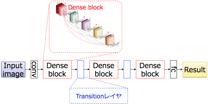 DenseNet은 위의 Dense블록을 복수로 겹쳐서 구성되어 있으며, 각 Dense블록은 transition층에 의해 연결된다. Transition레이어는 bn-conv 1x1 -avepool 2x2로 구성되어 있다. 이러한 transition 레이어는 보통 입력 채널수와 출력채널수를 동일하게 되지만, θ∈(0,1)에 의한 정의된 압축률만큼 출력 채널 수를 감소하는 것도 제안되어 있으며, θ=0.5가 이용된다. 평가 실험에서는 bottleneck을 이용하는 한편 trasition 레이어에서 압축을 하여, k 및 층수가 커졌던 버전의 인식 정확도가 높아졌다.