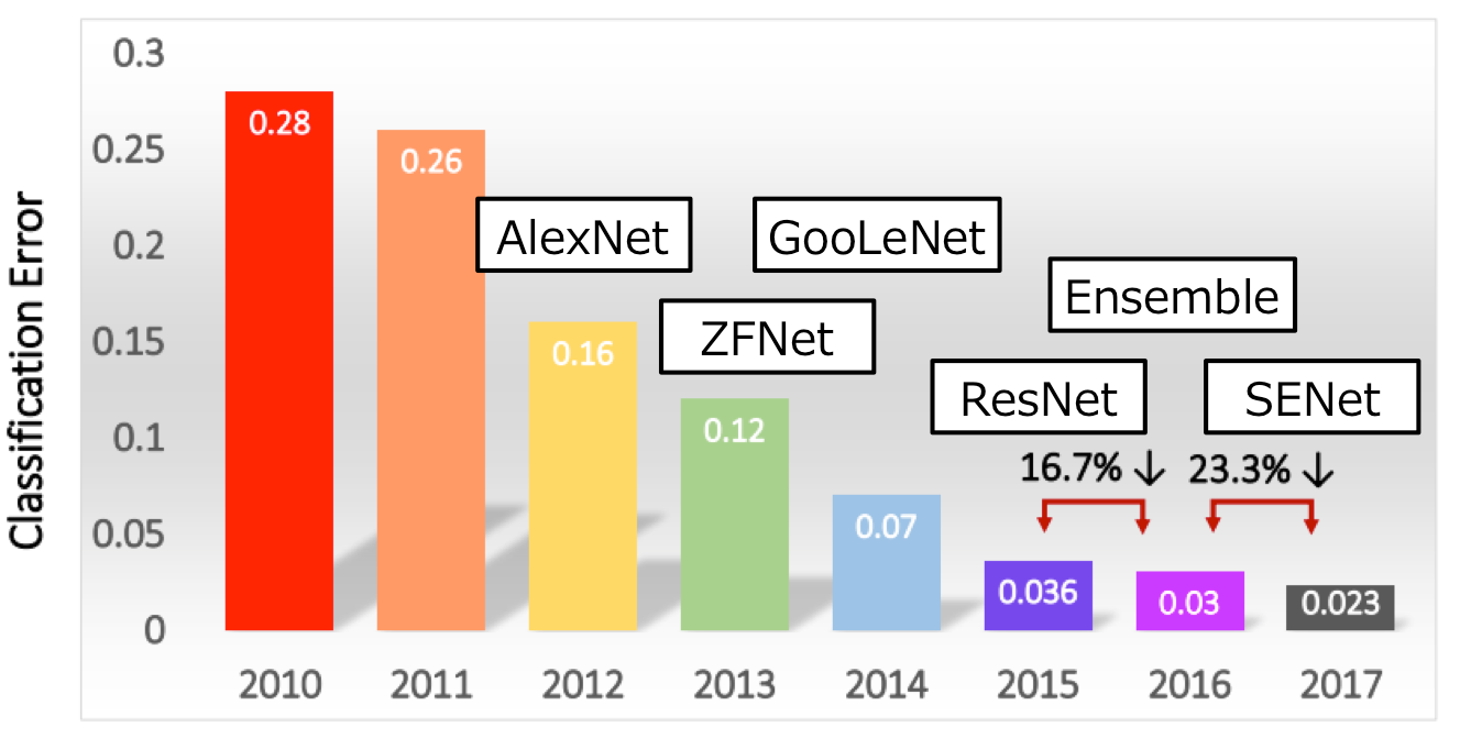 본 장에서는 2012년부터 2017년 까지의 ILSVRC의 클래스 분류 업무(아래에서는 간단히 ILSVRC)에 있어서 우수한 성적을 거둔 모델을 순서대로 되돌아보며, CNN가 어떻게 진화해왔는지 대충 살펴보자. 아래의 그림에 2010년부터 2017년의 ILSVRC의 클래스 분류 업무에서 달성한 top-5 에러율과, 2012년이후의 CNN베이스의 모델을 표시하였다.