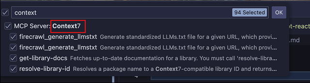 이것으로 설정이 완료이다. 설정되어 있는지 확인하려면. 채팅을 에이전트 모드로 변경한후 툴 모양의 아이콘을 클릭하면된다. 표시된 목록중 VS Code의 맨 위에 Context7이 표시되어 있다면 성공적으로 설정된 것이다.