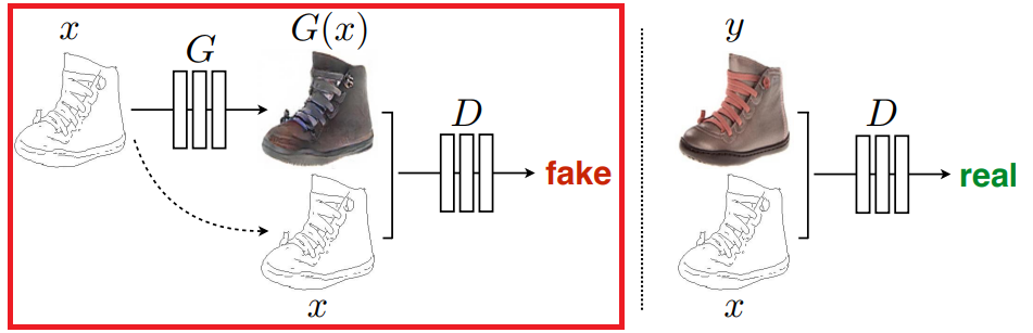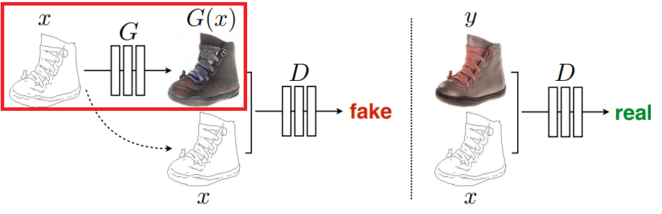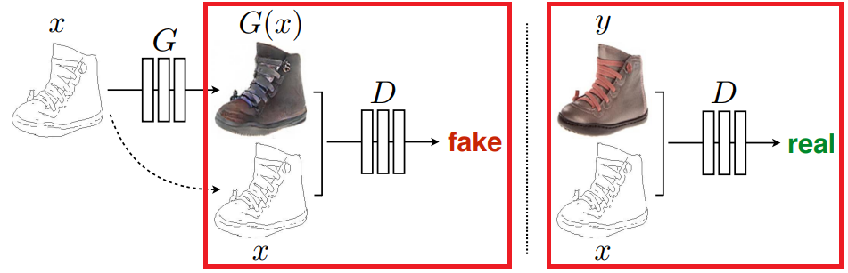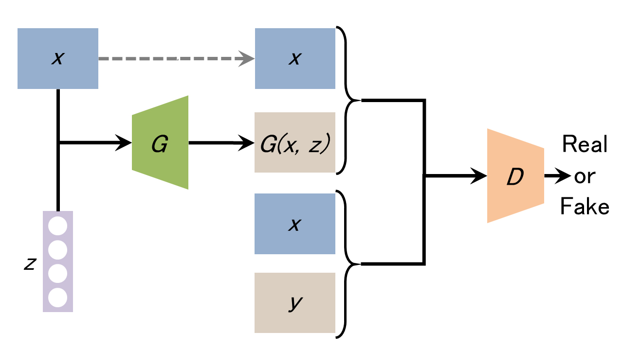 Generator은 조건 이미지 x와 노이즈 벡터 z로부터 이미지 G(x,z)를 생성한다. 한편 Discriminator은 '조건 이미지 x와 실제이미지 y의 짝'과 '조건 이미지x와 생성이미지G(x,z)의 짝'이 각각 진짜인지 아닌지를 판별한다. 이러한 구성에 의해, Generator이 조건 이미지로부터 진짜와 같은 이미지를 생성할 수 있도록 이미지 짝의 관계를 학습한다. 조금 더 자세한 설명은 링크를 참조하길 바란다.