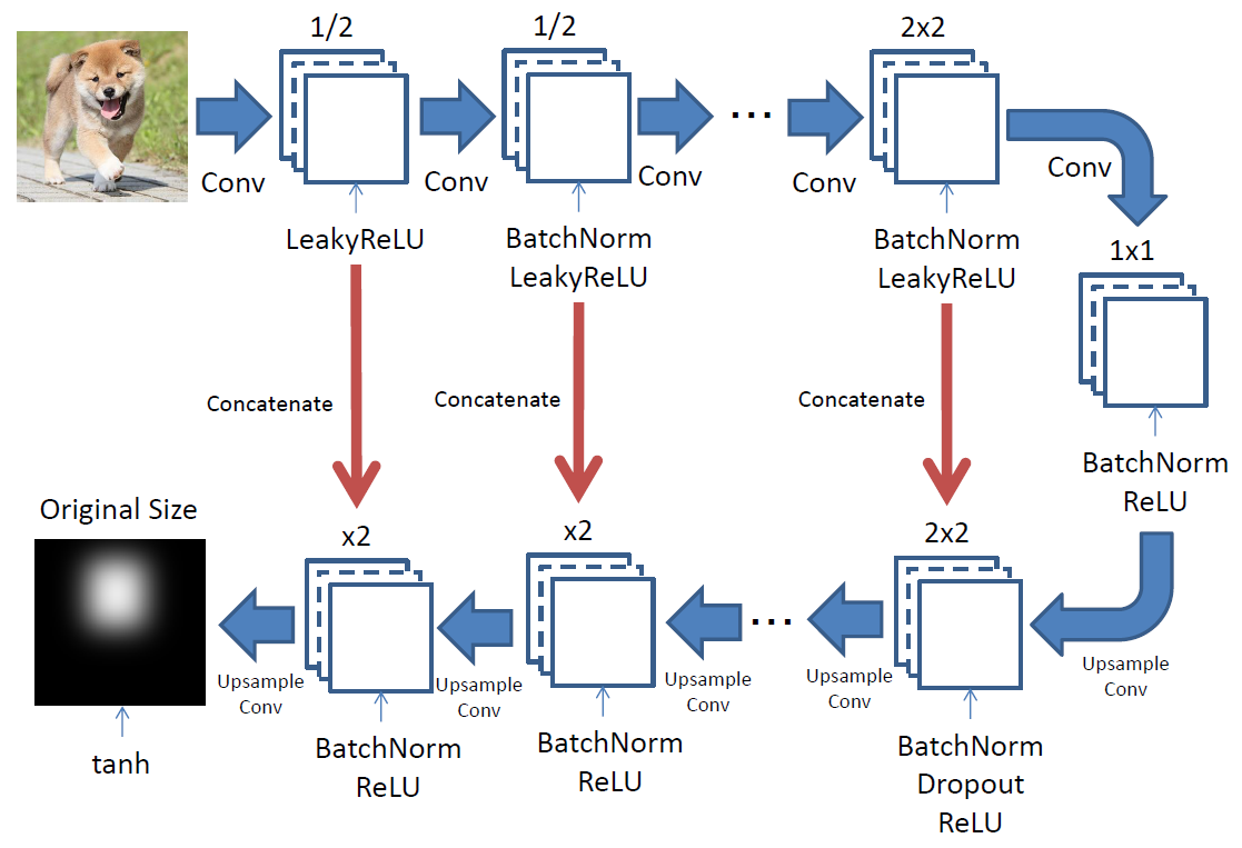 여기 L1정규화를 실시하는 것이 pix2pix의 또 다른 포인트이다. 여기서 흐림을 더함으로써 저주파 성분의 특징을 파악할 수 있게 되는 것 같다. 한편 학습은 먼저 에포크로 반복된다. 그 중간에 미니 배치용으로 학습 데이터를 작성(순서는 매번 랜덤)하여, 이번에는 미니 배치 단위로 실행된다. 또한 중간에 배치를 나눈 이미지를 작성하여, 원본의 이미지와 진짜의 마스크 이미지 혹은 가짜의 마스크 이미지(Generator에서 생성)의 조합으로 Discriminaotr을 학습시킨다.