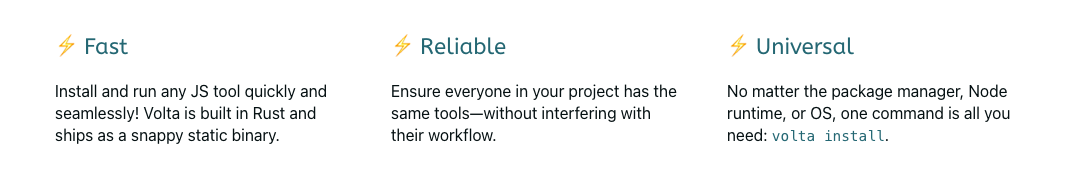 - Fast : Volta는 Rust로 제작되었으므로 다른 버전 관리 도구보다 더 빠르다.