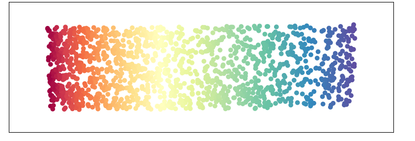 그러나 실제로는 빨간색과 오렌의 쪽이 가까운 데이터이다. 만일 아까의 이미지가 컬러가 아니고 전형 정보가 없다고 하자. 그렇다고 해도 보통은 하나로 연결되어 있다는 것이 주목하고 싶어 질 것이다. 멀어도 하나로 연결되어 있는 쪽이 가깝다고 생각하는 방식이어도 좋을 것이며, Manifold Learning이 이러한 방법을 제공한다.
