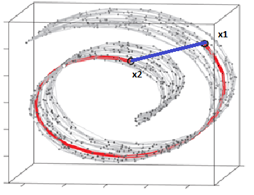 Isomap은 각 데이터 별로 충분히 가까운 데이터들에 대한 인접 그래프를 얻어 매니폴드를 표현하는 과정이다. 이때 두 데이터(노드) 간의 최단 경로를 euclidean distance를 기반으로 구하며, 이는 곧 high-dimensional space에서도 충분히 local한 영역에 대해서는 euclidean space를 합당하게 가정할 수 있기 때문이다.