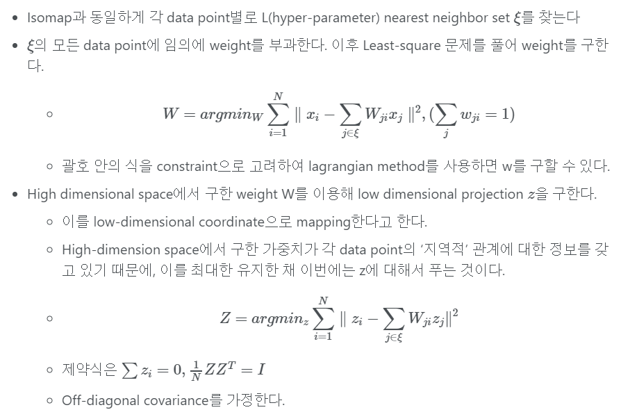 LLE 역시 geometric intuition에 기반한 linear model를 이용해 manifold를 배운다. High-dimensional data는 Global한 관점에서 non-linear하지만, 이를 우선 무시하고 Isomap과 비슷하게 각 데이터의 이웃들이 locally linear하다고 해보자. 원 데이터 을 으로 보내는 것이 목적이다.