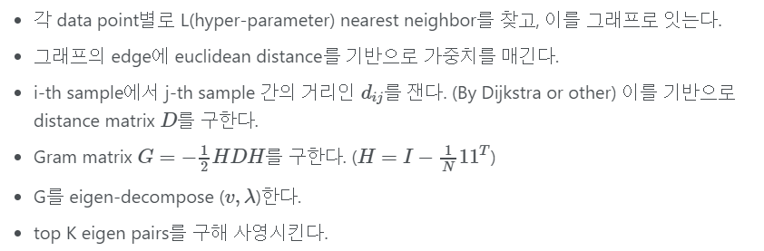 Isomap은 가장 오래되고 기초적인 manifold learning 알고리즘 중 하나이다. 데이터 간의 linear distance를 기반으로 graph representation을 학습한다. 과정은 다음과 같다.