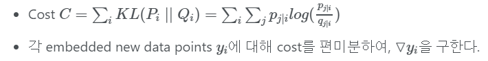 이렇게 i-th data point에 대해 high, low-dimensional neighborhood probabilistic distribution 를 얻었다. SNE의 핵심은 서로 다른 두 space에서 구한 distribution이 크게 차이가 나지 않도록 만든다는 것이다.