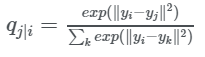 으로, conditional probability 형식이 아니다. 또한 student t-distribution을 사용하는데, 이는 t-distribution이 gaussian 대비 heavy tail을 갖기 때문에 high dimension space에서의 large distance를 반영하기 더 유리하기 때문이다.