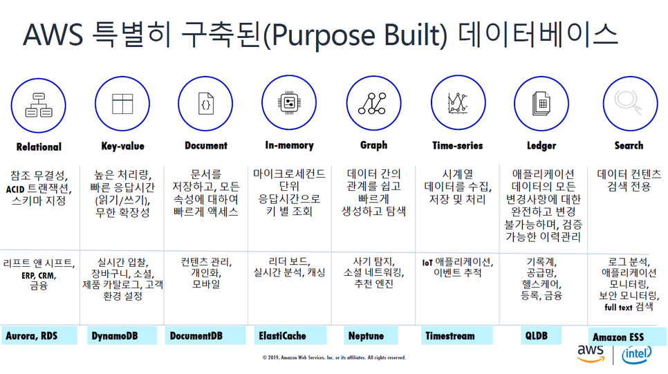 - key-value : 높은 처리량, 빠른 응답시간(읽기/ 쓰기) 무한 확장성