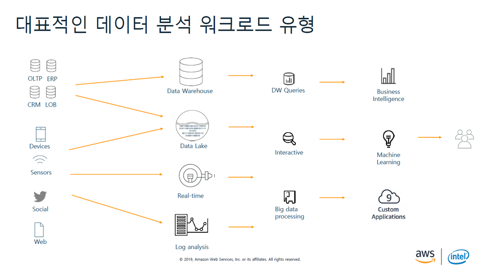 AWS의 데이터 레이크에 한번 수집된 데이터는 간단한 분석 쿼리에서 복잡한 집계쿼리, 반전형 빅데이터 프로세싱도 가능해지고 머신러닝까지 확장이 가능하다.
