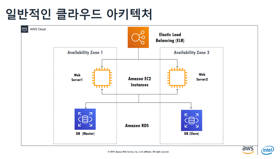 AWS 클라우드로 구축한다고 하면, 로드밸런스가 있어서 서버 두대로 나눠서 서버 하나가 죽더라도 계속 서비스 가능하고 DB도 두 대로 나눠서 DB가 죽더라도 슬래이브 DB가 서비스를 계속 이용할 수 있게 한다. 이러한 아키텍처가 가용성도 높고 가장 기본적인 아키텍처이다.