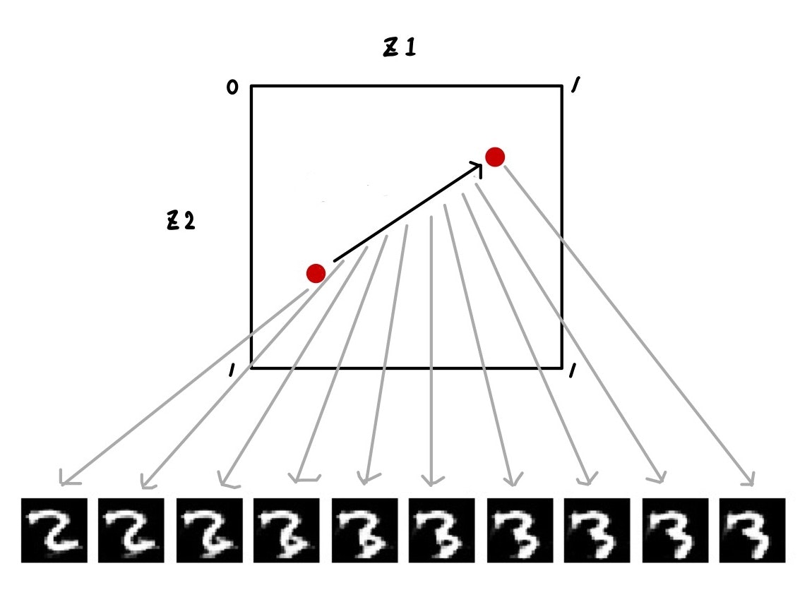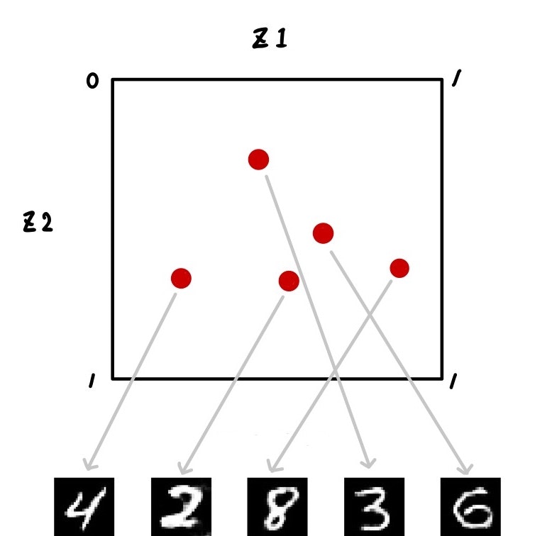 잠재변수 공간상 z의 어떤 값에 대해, 정해진 이미지가 출력된다. 여기서는 그림으로 표시하기 위해 z를 차원으로 하고 있다. 랜덤으로 샘플링한 각 z로부터 대응하는 이미지가 생성되고 있는 그림이다.