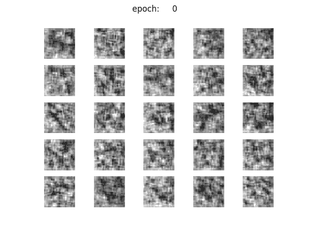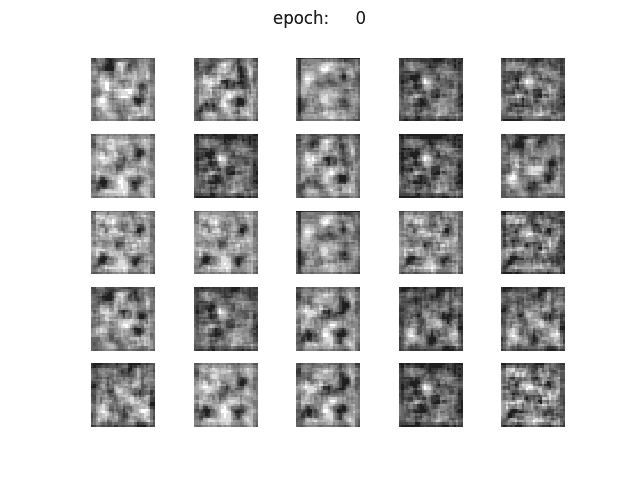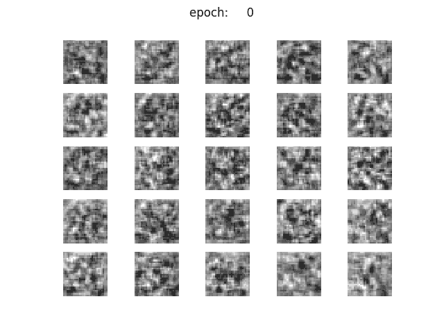 이미지의 퀄리티 자체는 z_dim =100과 큰 변화가 없으나, iteration을 거쳐도 각 칸에서 생성되는 숫자가 정해져 있다는 느낌은 들지 않는다. 숫자가 휙휙 바뀌고 있으며, 흔들림이 없는 느낌이다. 학습마다에 generator함수가 바꿔 쓰여있어, z의 맵핑이 수렴되지 않는듯한 느낌이다. 또한, 잘 보면 5x5의 25칸 중에 같은 이미지가 많은 느낌이 든다.