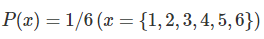 주사위를 예로 들어 이해하기 쉽게 설명해보도록 하겠다. 어떤 주사위를 굴리는 현상을 관측했을 때, 다수의 시행의 결과, 주사위의 눈이 나태나는 1차원 변수 x의 값은 1, 2, 3, 4, 5, 6 중 하나를 취하게 되며, 그 확률이 전부 동일한 것을 알 수 있다. 이 경우, x의 확률밀도분포는