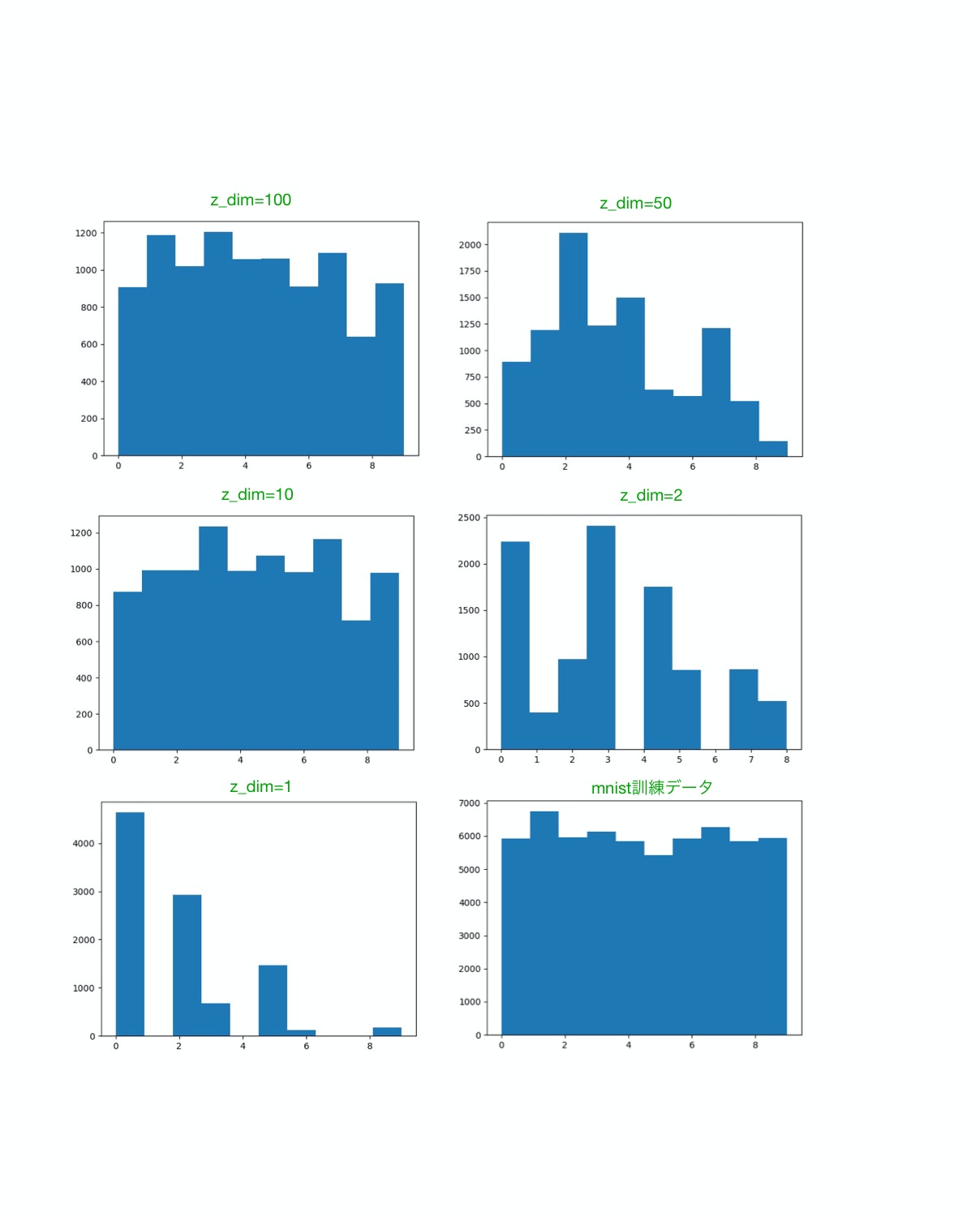 각 차원 수의 생성 모델에서, 99000 iteration후에 10000샘플 생성시켰을 때의 각 숫자의 빈도를 픽토그램으로 표현하면 아래의 그림과 같다. 그렇다고 해도, 실제로 어떤 숫자를 GAN가 만드는지에 대해서 알 수 없으므로, 그 대신에 숫자를 식별하는 모델을 CNN_classifier로써 구성하여 (keras의 example에 있는 것을 그대로 추가하였다), 그 식별 결과를 이용하였다. 따라서, 어디까지나 CNN_classifier가 생각한 픽토그램이다. 이것을 보아도 샘플링을 모조리 생성하고 있는 것은 z_dim = 100, 10일 경우라는 것을 알 수 있다.