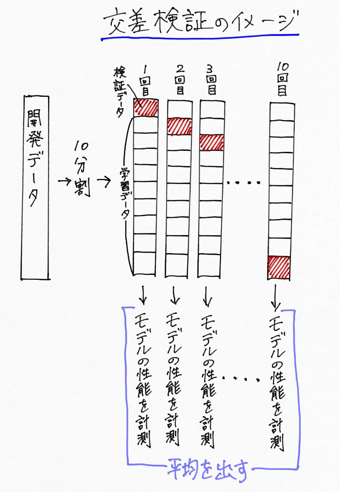 | [교차 검증의 흐름] (10분할 교차검증의 경우) 먼저 전체 개발 데이터 세트를 10개의 subset으로 나누고 '9할은 훈련 세트', '1할은 테스트 세트로 한다' ↓ '훈련 데이터'로 모델의 학습을 실시한다. ↓ '테스트 세트'로 모델의 성능을 평가한다. ↓ 이 과정은 10회 반복하여 평가의 평균을 구해 성능을 평가한다. |