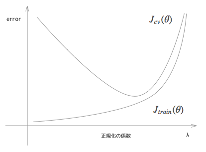 λ는 오버피팅을 조정하기 위한 계수였다. λ가 0이 되는 것은 정규화를 전혀 하지 않은 것과 같과 같기 때문에, 오버피팅에 대해 조정을 하지 않는 것과 동일하므로, 학습 데이터에 너무 핏되어 있어, cv 데이터에는 오차가 크다고 할 수 있는 위 그래프의 왼쪽의 상황이 된다.