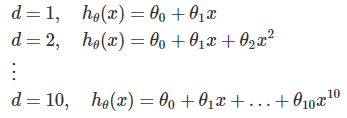 이 경우, 각 식에서 그 비용을 최소로 하는 θ를 계산한다. 지금, 다음 차수에 대응하는 θ에 위에 첨자를 붙여 아래와 같이 표현하고 있다. 이것은d=2일경우의예이다.