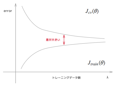 위 그래프는 High varicance의 경우의 학습 곡선이다. 이 경우, 트레이닝 데이터의 오차와 cv의 오차의 차이가 큰 것이 특징이다. 이 상황에서는 학습 데이터를 증가시키는 대책도 일정한 효과를 준다.