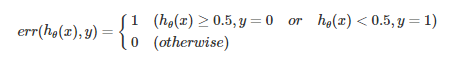 식을 보았을 때 어려워 보일 수 있으나 자세히 보면 간단하다. 요점은 가설함수가 0.5이상인 y=1을 예측하지만, 실제로는 y=0인 경우에 에러 (=1)로써, 동일하게 가설함수가 0.5미만인 경우 y = 0을 예측해야 하는데 실제로 y =1이 된 경우에도 에러 (=1)로써 처리하고 그 외에는 비(非)에러(=0)으로 표기할 뿐이다.