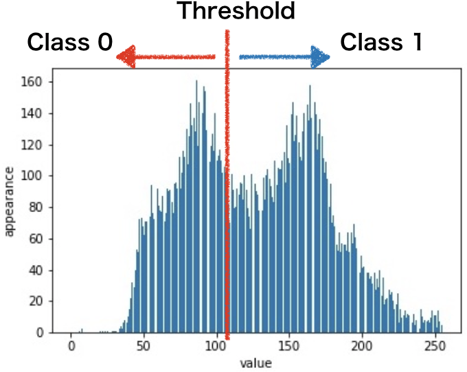 종합하자면 역치를 [0, 255]의 각 값에서 클래스 간 분산도를 계산해, 최대가 된 역치가 최적의 임계치가 된다.