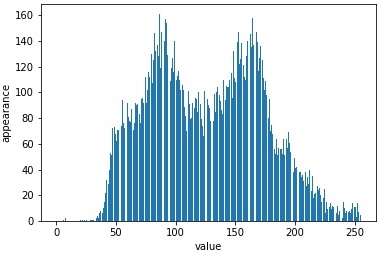 그레이스케일의 휘도치(픽셀값)의 히스토그램은 아래와 같다.