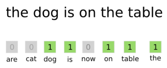 어떤 문장(혹은 문서)에 n개의 단어가 있다면 n개의 인덱스를 가지는 리스트를 만들고 그 문장(혹은 문단)에 각 인덱스에 해당하는 문자가 몇 개가 있는지 카운트한다. 즉, 단어별로 인덱스를 부여해서, 한 문장(또는 문서)의 단어의 개수는 Vector로 표현하는 것이다. 이러한 기법은 Bag of words라고 한다.