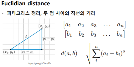 위에서 얘기했듯 피타고라스 정의를 이용해 두 점 사이의 직선 거리를 구하는 방법(Euclidian distance)이 있다. 그 외에도 두 점 사이의 각도 (Cosine distance)를 측정해서도 결과를 얻을 수 있다.