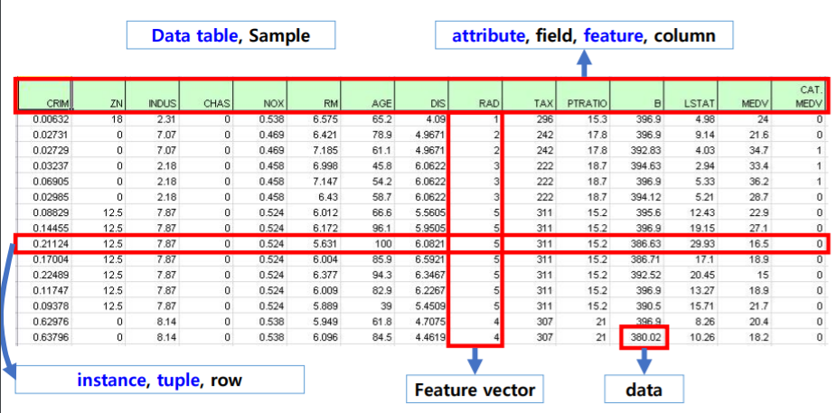 - 하나의 data instance(실제 데이터)는 feature vector로 표현한다.