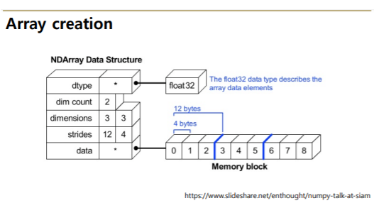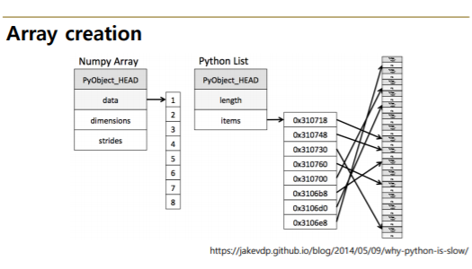 - Numpy는 C로 구현되어 있어, 성능을 확보하는 대신 파이썬의 가장 큰 특징인 dynamic typing을 포기함